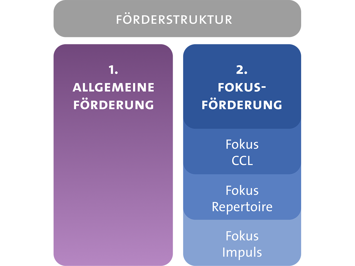 30 % der Fördermittel werden wie bisher für besondere Repertoires eingesetzt. Die Förderung eröffnet in Zukunft grundsätzlich Chancen für alle Mitglieder. Sie besteht aus drei Modulen: