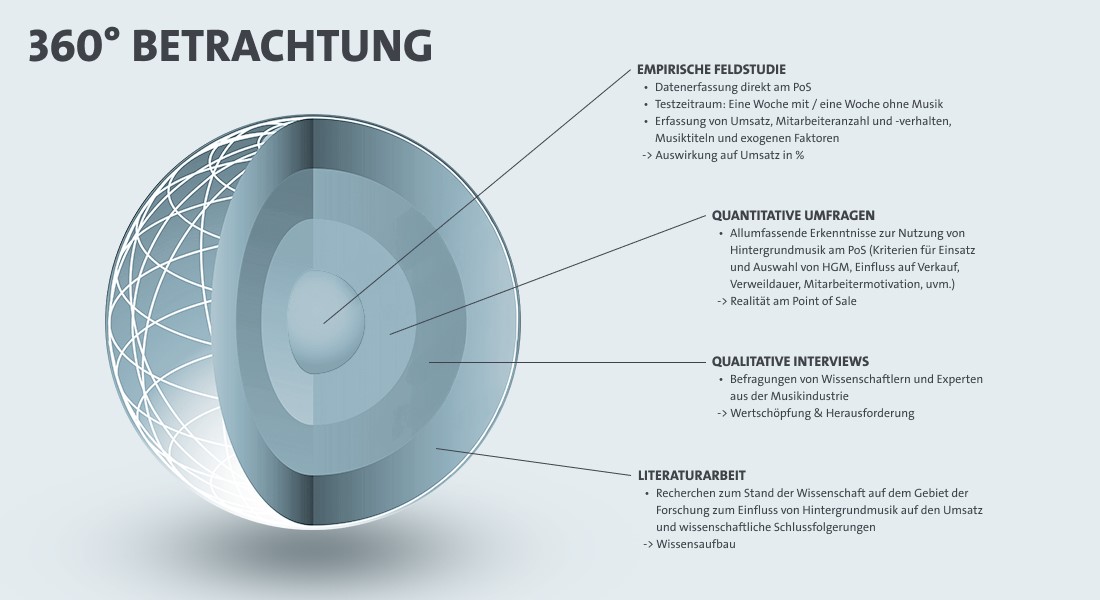 Die Music Impact Studie verfolgt den Ansatz, mit verschiedenen Forschungsmethoden eine möglichst 360 Grad Perspektive auf den Zusammenhang zwischen Musik und Umsatz zu gewinnen. Um ein möglichst umfassendes Bild auf die Thematik zu erhalten, bauen die Erhebungen aus der empirischen Studie, aus quantitativen Umfragen, Experten-Interviews sowie Fokusgruppen aufeinander auf.